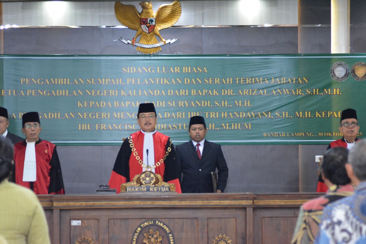 Tanjung Karang – Pengadilan Tinggi (PT) Tanjung Karang, Lampung menggelar Sidang Luar Biasa dalam rangka serah terima jabatan Ketua Pengadilan Negeri (PN) Kalianda dan PN Menggala, pada Kamis (30/10) di Aula Bagir Manan.