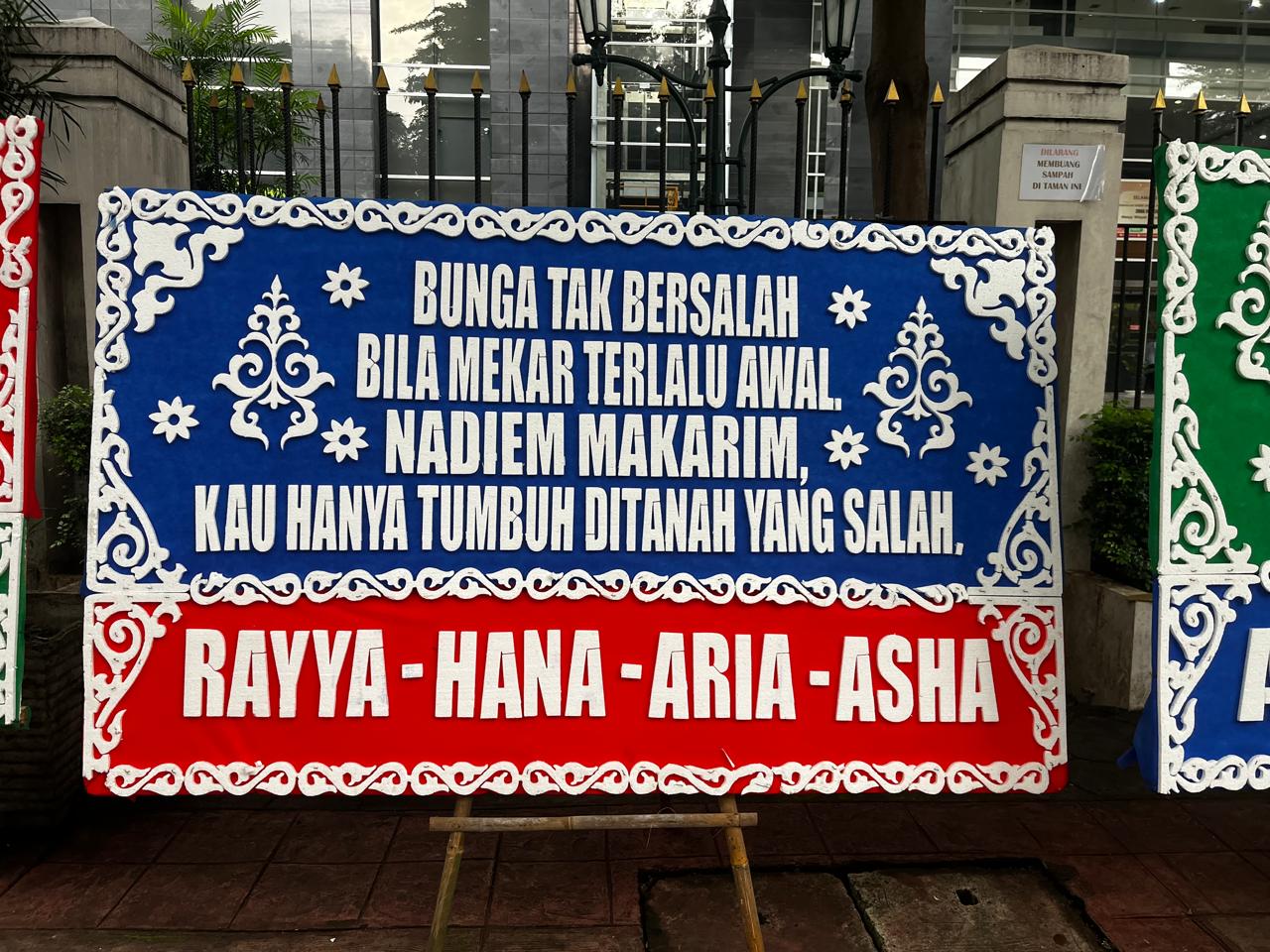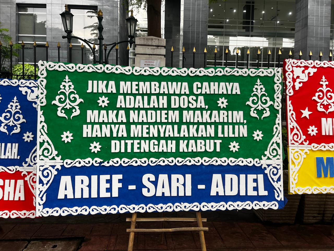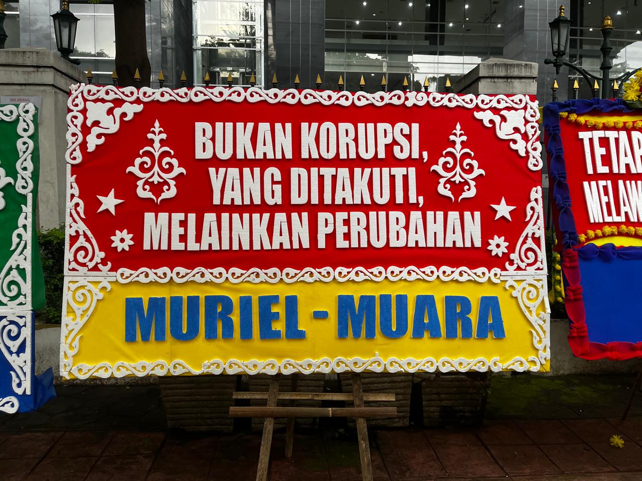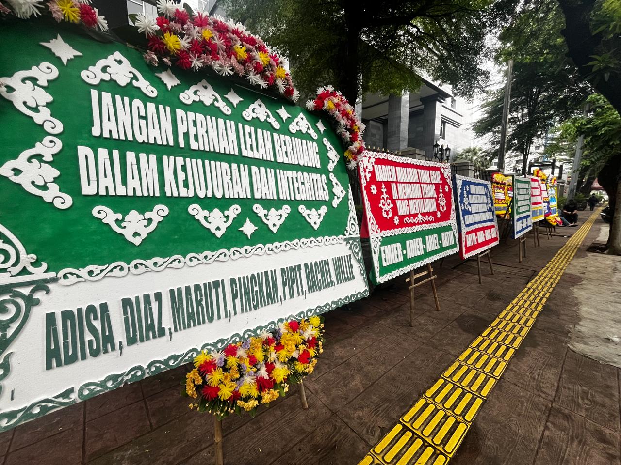 Menjelang pembacaan dakwaan itu, sejumlah karangan dukungan berjejer di depan PN Jakpus. Karangan bunga datang sejak pagi buta dikirim oleh tukang kembang.