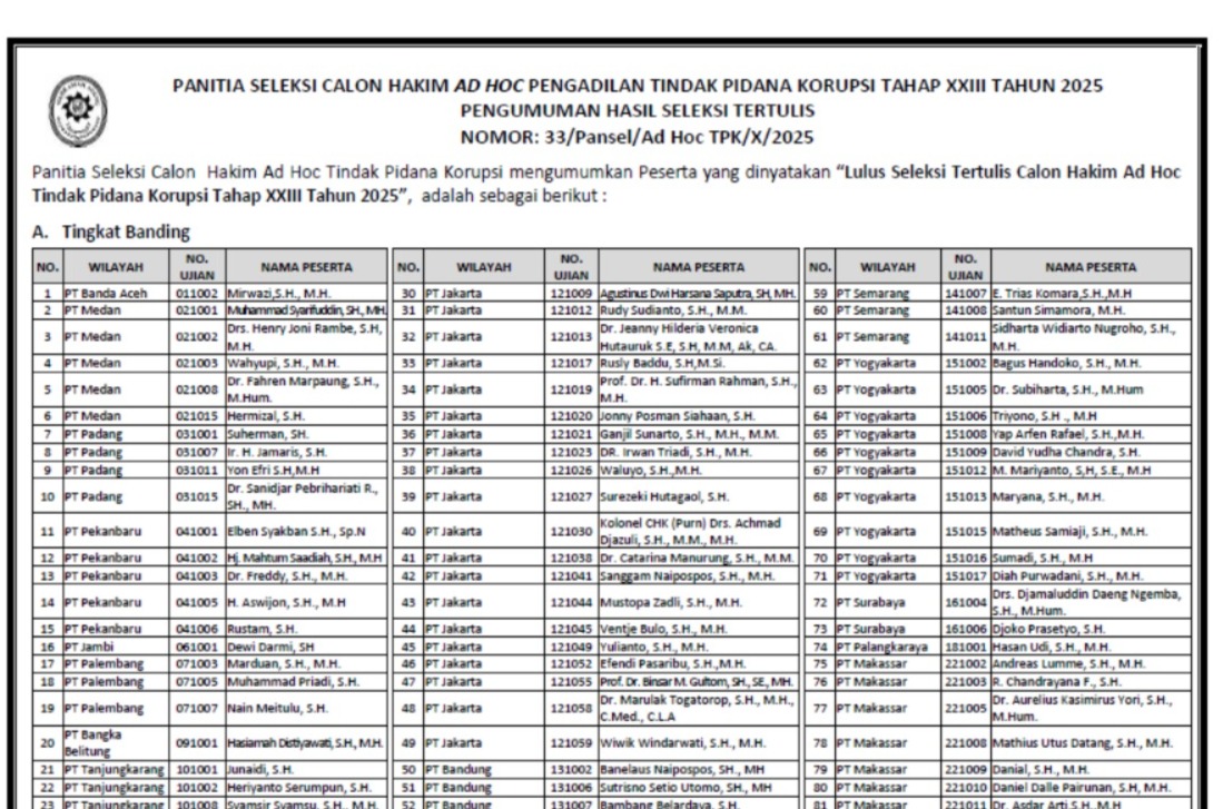 Jakarta – Sebanyak 175 Calon Hakim Ad Hoc Pengadilan Tindak Pidana Korupsi (Tipikor) dinyatakan lulus seleksi tertulis dalam rangkaian Seleksi Calon Hakim Ad Hoc Tipikor Tahap XXIII Tahun 2025. Pengumuman hasil seleksi ini tertuang dalam Surat Panitia Seleksi Nomor: 33/Pansel/Ad Hoc TPK/X/2025 yang diterbitkan pada Rabu (8/10).
