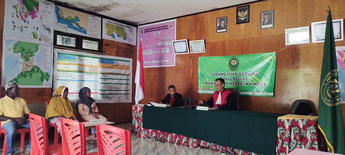 PN Kaimana di Papua Barat terus berupaya mendekatkan pelayanan peradilan kepada masyarakat salah satunya dengan menyelenggarakan sidang di luar gedung pengadilan. Pelaksanaan sidang ini dapat dilakukan secara bergilir di berbagai lokasi (sidang keliling) atau di tempat sidang tetap yang sudah ditetapkan di luar gedung pengadilan (zitting plaats). (Jatmiko Wirawan/al/ldr)