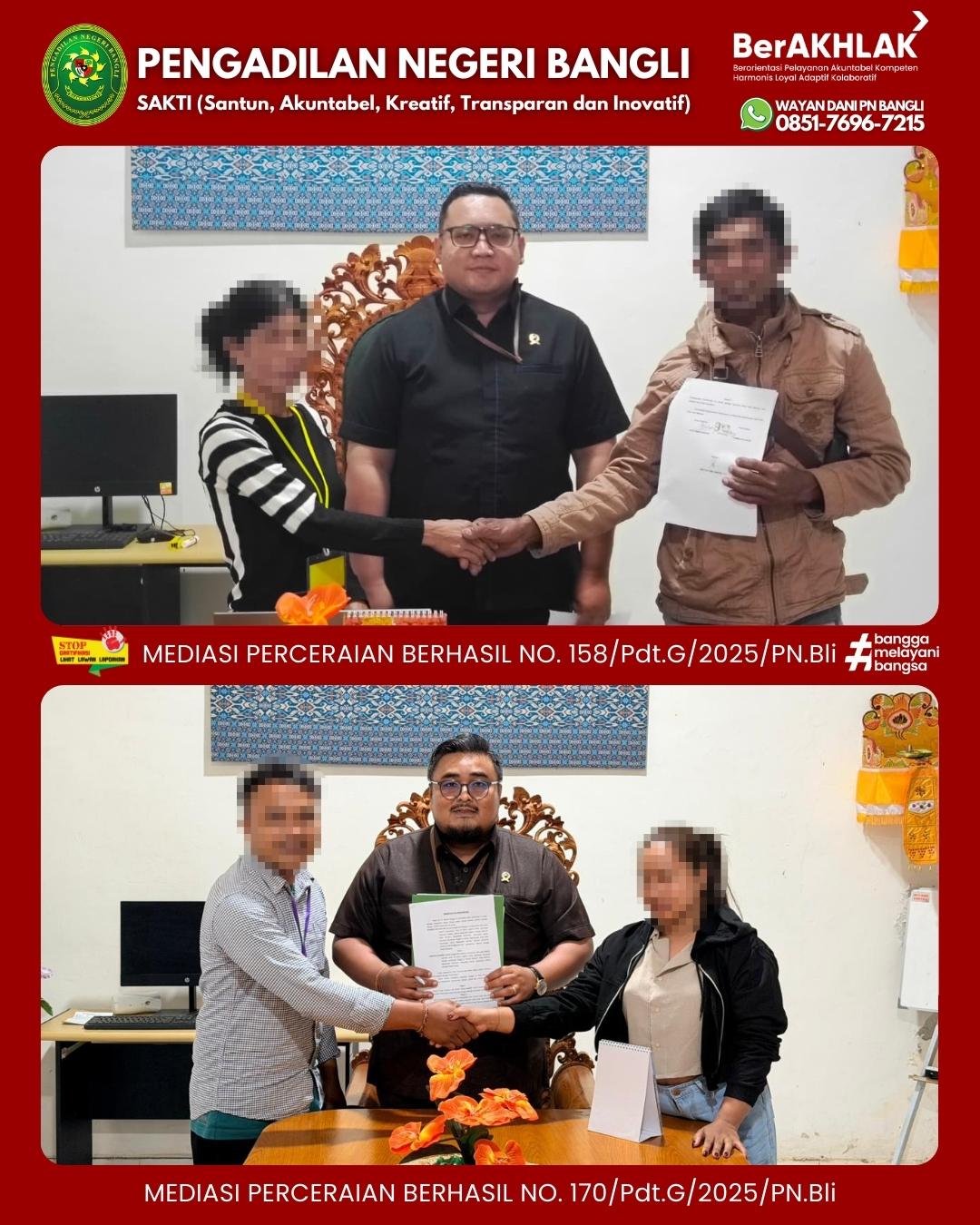 Widyastomo Isworo berhasil mendamaikan perkara perceraian Nomor 158/Pdt.G/2025/PN Bli. Sementara itu, Mediator Hakim Seftra Bestian sukses mengupayakan perdamaian dalam perkara Nomor 170/Pdt.G/2025/PN Bli.