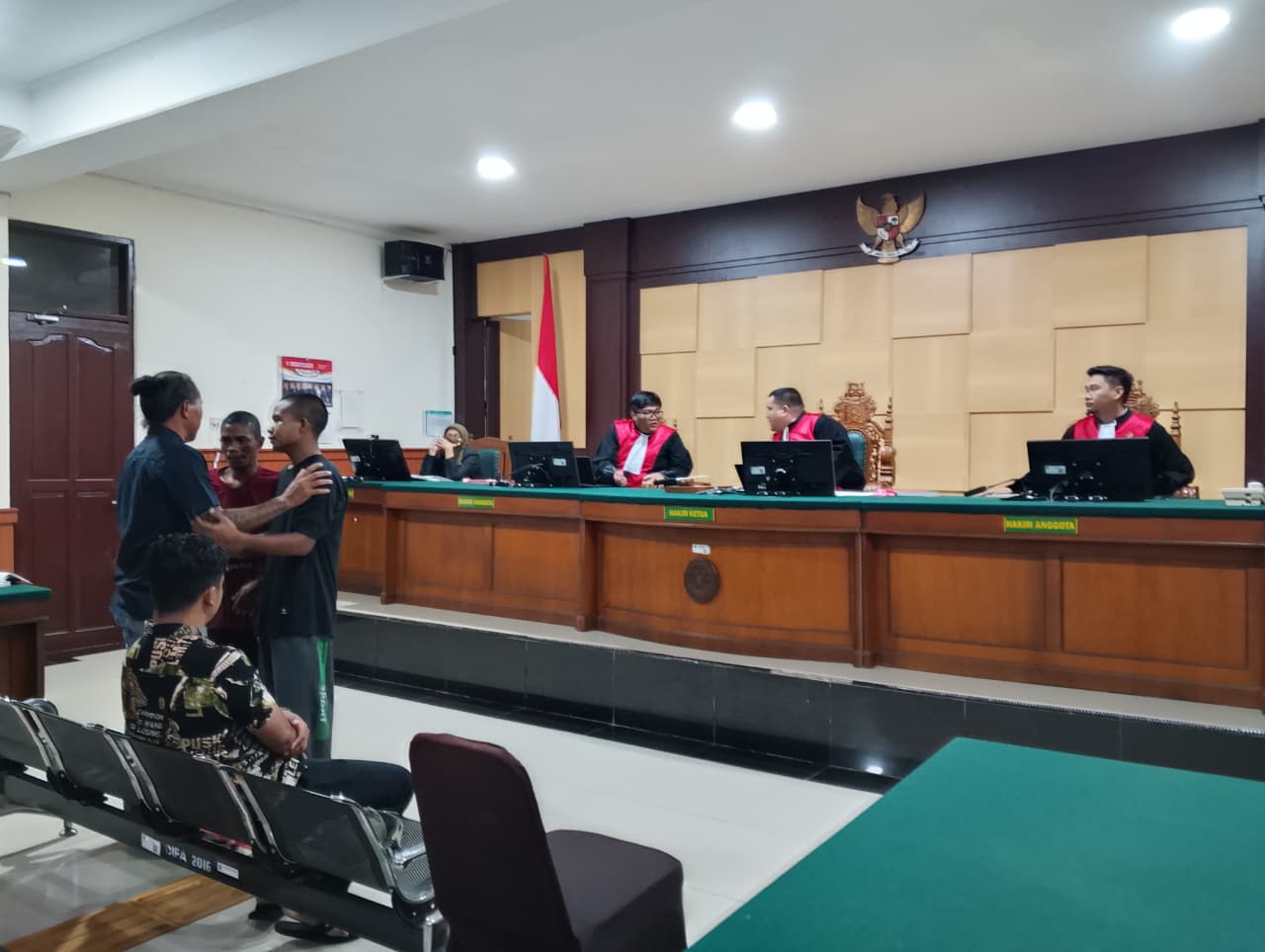 Mendengar itu, para terdakwa pun menangis dengan terisak, memeluk korban, dan memohon maaf kepada korban. Pelukan itu dibalas I Komang dengan hangat seperti seorang ayah memaafkan anaknya.