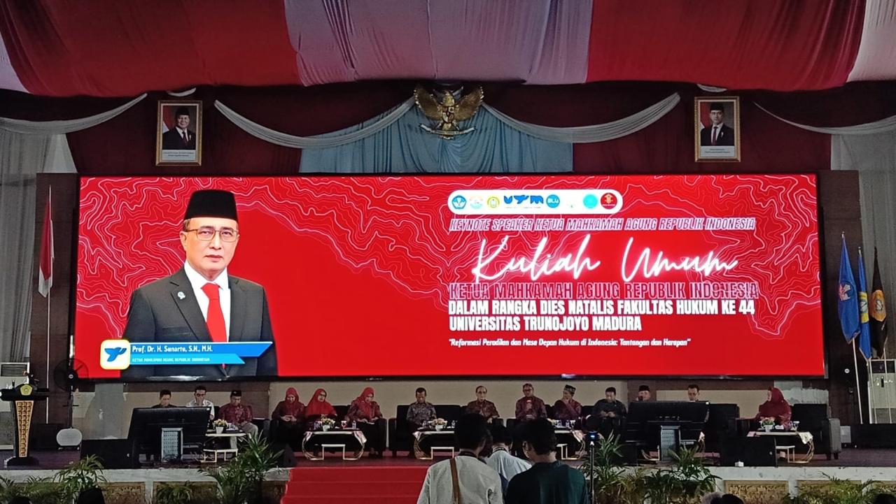 Bangkalan- Ketua Mahkamah Agung (MA) Prof Sunarto menghadiri undangan Universitas Trunojoyo Madura (UTM) Jawa Timur untuk memberikan kuliah umum bertemakan ‘Reformasi Peradilan dan Masa Depan Hukum di Indonesia: Tantangan dan Harapan’. Ia membahas mengenai relevansi integritas dalam segala profesi hakim sebagai tombak utama lembaga peradilan.