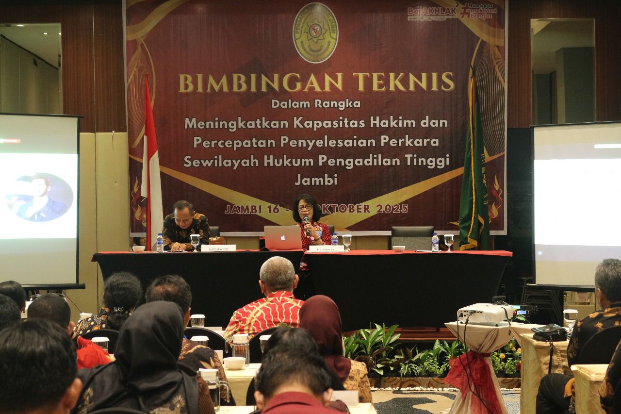 Jambi - Ketua Pengadilan Tinggi (PT) Jambi, Ifa Sudewi tegaskan peran penting Juru Bicara (Jubir) Pengadilan dalam membangun citra positif lembaga peradilan di mata publik. Hal tersebut disampaikan dalam kegiatan Bimbingan Teknis Peningkatan Kapasitas Hakim dan Percepatan Penyelesaian Perkara di Aston Hotel Jambi, pada Kamis (16/10/2025).