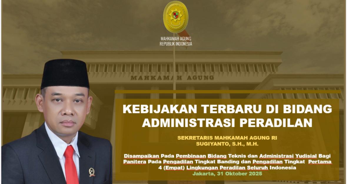 Jakarta - Sekretaris Mahkamah Agung Republik Indonesia, Sugiyanto memberikan materi sekaligus pembinaan mengenai kebijakan administrasi peradilan pada pembinaan teknis dan administrasi yudisial bagi panitera pada pengadilan tingkat banding dan tingkat pertama 4 lingkungan peradilan seluruh Indonesia pada hari Jumat (31/10/2025).